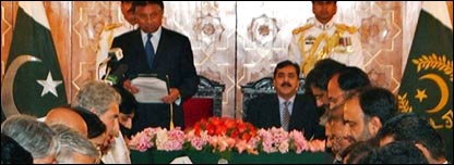 پاکستان کی پارلیمانی اور جمہوری تاریخ میں پہلی مرتبہ پیپلز پارٹی، مسلم لیگ (ن)، عوامی نیشنل پارٹی اور جمعیت علماء اسلام (ف) پر مشتمل حکمراں اتحاد کی کابینہ نے حلف اٹھایا لیا ہے۔ صدر پرویز مشرف نے ابتدائی مرحلے میں چوبیس وزراء پر مشتمل کابینہ سے ایوان صدر میں حلف لیا۔ نئی کابینہ میں پیپلز پارٹی کے گیارہ، مسلم لیگ (ن) کے نو، عوامی نیشنل پارٹی کے دو، جمعیت علماءاسلام کا ایک اور فاٹا سے ایک وزیر شامل ہیں۔ مغربی سوٹ میں ملبوس صدر پرویز مشرف اور وزیر اعظم سید یوسف رضا گیلانی دونوں حلف برداری کی تقریب میں شرکت کے لئے اکٹھے ہال میں داخل ہوئے۔ حلف کے فورا بعد صدر نے نئے وزراء کو مبارک باد بھی دی۔