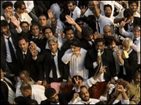 پاکستان کی مختلف ہائی کورٹ بار ایسوسی ایشنوں نے اپنے اجلاس میں وکلا تحریک مؤثر بنانے کے لیے لانگ مارچ یا ٹرین مارچ کرنے کے بجائے ملک کی تمام عدالتوں کی تالابندی کرنے کی سفارش کی ہے۔ ہائی کورٹ بار ایسوسی ایشنوں کا اجلاس لاہور میں ہوا جس میں صوبہ پنجاب اور سندھ کی ہائی کورٹ بار ایسوسی ایشنوں کے عہدیداروں نے شرکت کی۔ لاہور ہائی کورٹ بار کے سیکرٹری رانا اسد اللہ خان کے بقول بلوچستان ہائی کورٹ بار کے سالانہ انتخابات کی وجہ سے اس کے عہدیدار اجلاس میں شرکت نہیں کرسکے جبکہ صوبہ سرحد کی ہائی کورٹ بار کے عہدیدار وکلا رہنما کی وفات کی وجہ سے شریک نہیں ہوئے۔ اجلاس میں ہائی کورٹ بار کے عہدیداروں نے وکلا تحریک کو مؤثر بنانے کے لیے مخلتف سفارشات مرتب کیں جو پاکستان بارکونسل کے زیر اہتمام ہونے والے وکلا کنونشن میں منظوری کے لیے پیش کی جائیں گی۔ ہائی کورٹ بار ایسوسی ایشنوں کےاجلاس کے بعد راولپنڈی ہائی کورٹ بار کے صدر سردار عصمت اللہ خان نے پریس کانفرنس میں کہا کہ حکومتی اتحاد کی طرف سے عدلیہ کی بحالی کے معاملہ پردرعمل مایوس کن ہے۔ان کے بقول ججوں کی بحالی کے حوالےسے مسلم لیگ نون کا کردار بھی زیادہ قابل ستائش نہیں ہے۔ انہوں نے بتایا کہ اجلاس میں یہ تجویز پیش کی گئی ہے کہ وکلا رہنما اور عہدیدار پی سی او ججوں کے سامنے پیش نہ ہوں اور کسی عہدیدار نے پی سی او ججوں کے سامنے پیش ہونا ہے تو وہ پہلے اپنے عہدے سے استعفی دے۔ انہوں نے کہا کہ اجلاس میں پیپلز پارٹی کے آئینی پیکیج کو مسترد کردیا گیا ہے۔ ان کے بقول اجلاس کے شرکا کا کہنا ہے کہ یہ آئینی پیکیج عدلیہ کی آزادی سلب کرنے کے مترادف ہے۔ سردار عصمت اللہ نےبتایا کہ دس جولائی کو راولپنڈی بار کے وکلا عدلیہ کی بحالی کے لیے شاہراہ دستور پر ایک ریلی نکالیں گے۔ انہوں نے کہا کہ اجلاس میں ایک کمیٹی بھی تشکیل دی گئی ہے جس کا نام کل پاکستان ہائی کورٹ بار ایسوسی ایشنز عدلیہ بحالی کمیٹی ہوگا اور یہ کمیٹی مقصد وکلا تحریک کو مؤثر اور تیز بنانا ہے۔ انہوں نے بتایا کہ اجلاس میں سندھ ہائی کورٹ بار ایسوسی ایشن اور ملتان کی تحصیل بار ایسوسی ایشن جہانیاں کی جانب سے حکومتی گرانٹ منظور نہ کرنے اور لاہور ہائی کورٹ بار ایسوسی ایشن کے صدر اور سیکرٹری کی طرف سے امریکہ کی یوم آزادی کی تقریب میں شرکت سے انکار کرنے کے اقدام کو سراہا گیا۔ | اسی بارے میں کراچی میں وکلاء کا احتجاج29 May, 2008 | پاکستان تمام جج بحال کرنا چاہتے ہیں: زرداری28 May, 2008 | پاکستان آزاد عدلیہ، اٹھاون ٹو بی: افتخار01 June, 2008 | پاکستان لانگ مارچ میں لال بینڈ12 June, 2008 | پاکستان ’اس سے زیادہ ہم کیا کر سکتے ہیں‘14 June, 2008 | پاکستان لانگ مارچ کے بعد اٹھنے والے سوالات14 June, 2008 | پاکستان انٹرنیشنل لائیرز کنونشن کا اعلان21 June, 2008 | پاکستان بارکونسل نےآئینی ترامیم مستردکردیں23 June, 2008 | پاکستان | ||||||||||||||||||||||||||||||||||||||||