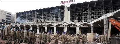 امدادی کارکن اسلام آباد کے میریئٹ ہوٹل کے ملبے میں ہلاک ہونے والوں کی لاشیں اور بچنے والوں کی تلاش کر رہے ہیں۔ جبکہ میریئٹ ہوٹل پر ٹرک بم دھماکے میں ہلاکتوں کی تعداد چون اور زخمیوں کی تعداد 250 بتائی گئی ہے۔ جائے وقوع پر موجود ہمارے نامہ نگار آصف فاروقی نے بتایا ہے کہ اتوار کی صبح سے امدادی کارکنوں نے ہوٹل کی چوتھی منزل سے آٹھ لاشیں نکالی ہیں جن میں ایک غیرملکی خاتون ہیں۔ امدادی کارکنوں نے ہوٹل کی پہلی، دوسری، تیسری اور پانچویں منزلوں پر تلاش کا کام مکمل کر لیا ہے۔ امدادی کارکنوں نے ہمارے نامہ نگار آصف فاروقی کو بتایا کہ چوتھی منزل پر تلاش کا کام ابھی جاری ہے۔ ان کا کہنا تھا کہ ہوٹل کی عمارت میں باہر جانے کے راستے نہیں تھے جس کی وجہ سے امدادی کارکنوں کو اندر جانے میں مشکل پیش آئی ہے جبکہ ہوٹل کے مہمان جو اندر تھے وہ اندر ہی پھنس گئے۔ ہمارے نامہ نگار کے مطابق امدادی کارکنوں نے ہوٹل کی عمارت کو محفوظ قرار نہیں دیا ہے کیونکہ عمارت کافی غیرمستحکم ہے اور اس کے گرنے کا خدشہ ہے۔ سنیچر کی شام میریئٹ ہوٹل کے باہر ہونے والے ٹرک بم دھماکے کی ذمہ داری کسی گروپ نے قبول نہیں کی ہے لیکن اسلام آباد میں بی بی سی کے ایک نامہ نگار کا کہنا ہے کہ طالبان شدت پسندوں پر انگلی اٹھائی جارہی ہے جن کے خلاف پاکستانی فوج کارروائیاں کررہی ہے۔ حکومتِ پاکستان نے دھماکے کے ذمہ دار افراد کے بارے میں اطلاع دینے والے کے لیے ایک کروڑ روپے کے انعام کا اعلان بھی کیا ہے۔
