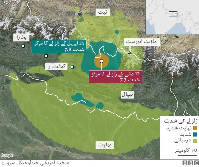 امریکی ارضیاتی سروے کے مطابق منگل کو آنے والے زلزلے کی شدت ریکٹر سکیل پر 7.3 تھی اور اس کا مرکز كٹھمنڈو سے 83 کلومیٹر مشرق میں ماؤنٹ ایورسٹ کے نزدیک واقع نامچے بازار نامی قصبہ تھا۔