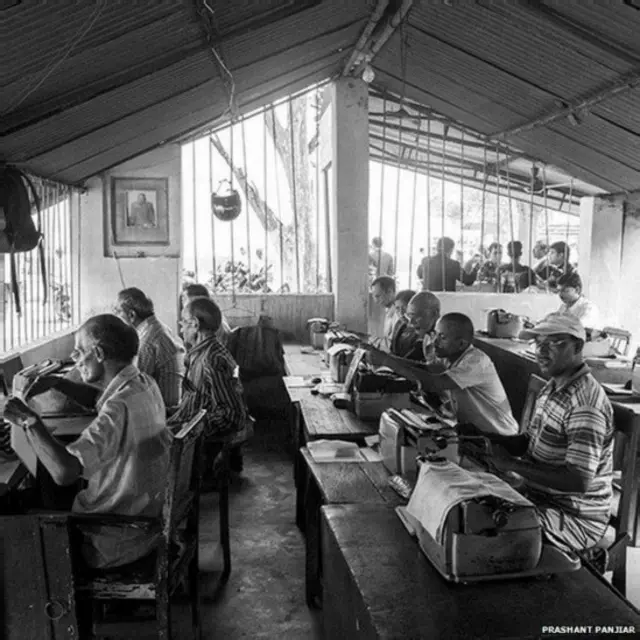 ٹائپ رائٹر پر کام کرنے افراد مرکزی عمارت کے باہر عدالتی دستاویزات پر کام کر ہے ہیں۔ بھارت کے بچے کھچے ٹائپسٹ آج بھی عدالتوں میں بھی دیکھے جا سکتے ہیں۔