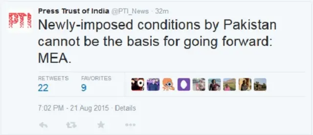 اس سے قبل بھارتی خبر رساں ایجنسی پی ٹی آئی نے اپنے مصدقہ ٹوئٹر ہینڈل پر یہ خبر دی تھی کہ پاکستان کی جانب سے کشمیر کے علیحدگی پسند رہنماؤں سے ملاقات نہ کرنے کی بھارتی تجویز مستردکیے جانے کے بعد بھارت نے 23 اگست کو نئی دہلی میں ہونے والی بات چیت منسوخ کر دی ہے۔