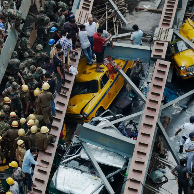 انڈیا کی ریاست مغربی بنگال کے شہر کولکتہ میں ایک زیر تعمیر پل کے گرنے سے کم از کم 23 افراد ہلاک ہوگئے ہیں امدادی کارروائیاں جاری ہیں تاہم ملبے تلے سے کسی کے زندہ بچ جانے کی امیدیں ختم ہوتی جارہی ہیں۔
