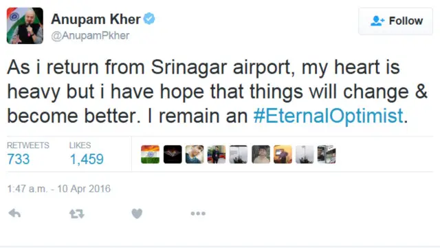 انوپم کھیر کو اتوار کے روز جموں و کشمیر پولیس نے سری نگر ہوائی اڈے پر ہی روک لیا گیا تھا اور انھیں نیشنل انسٹی ٹیوٹ آف ٹیکنالوجی (این آئی ٹی) تک نہیں جانے کی اجازت نہیں دی گئی تھی۔