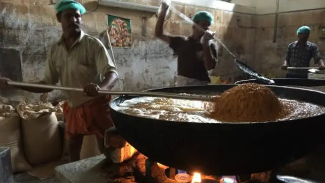 ان تروپتی لڈوؤں کو مندر کے باورچی خانے ’پوٹو‘ میں تیار کیا جاتا ہے اور ایک دن میں تقریباً تین لاکھ کے قریب لڈو بنتے ہیں۔