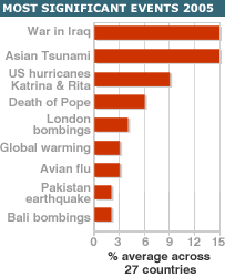 بی بی سی ورلڈ سروِس کے ذریعے کرائے جانے والے رائے شماری کے ایک جائزے کے مطابق دنیا کے بیشتر علاقوں میں لوگ سمجھتے ہیں کہ سن دوہزار پانچ کو قدرتی آفات کے لیے یاد رکھا جائے گا۔ رائے شماری کے اس جائزے کے مطابق لوگوں کے ذہن میں نقش رہنے والے تین سب سے اہم بین الاقوامی واقعات سونامی، کٹرینا اور جنگِ عراق تھے۔ کچھ دلچسپ باتیں جو اس سروے میں سامنے آئیں وہ حسب ذیل ہیں: ٭ انڈونیشیا میں سال کا سب سے بڑا واقعہ سونامی نہیں بلکہ بالی بم دھماکوں سے متعلق خبریں تھیں۔ ٭ سمندری طوفان کٹرینا کو امریکہ سے زیادہ افغانستان اور ارجینٹینا میں سال کا اہم واقعہ سمجھا گیا۔ ٭ ہندوستان میں پاکستان کے زلزلے کو بالکل ہی اہم تصور نہیں کیا گیا۔ افغانوں کے لیے پاکستان کا زلزلہ سب سے اہم ثابت ہوا۔ ٭ لندن بم دھماکوں کو برطانیہ کے بجائے گھانا میں سال کا اہم واقعہ تصور کیا گیا۔ ٭ برطانوی لوگوں کے لیے جنگِ عراق سے متعلق خبریں اہم نہیں ثابت ہوئیں۔ یہ رائے شماری ستائیس ملکوں میں کرائی گئی جن میں پاکستان شامل نہیں ہے لیکن اس کے دو پڑوسی ملک افغانستان اور ہندوستان کے لوگوں نے اس سروے میں حصہ لیا۔ بی بی سی نے یہ رائے شماری پولنگ کرنے والے ادارے گلوب سکین اور امریکہ کی میریلینڈ یونیورسٹی کے ماہرین کے ذریعے کرائی۔ سونامی طوفان کو رائے دہندگان میں سری لنکا سے ستاون فیصد نے، ہندوستان سے اکتیس فیصد اور انڈونیشیا سے تیس فیصد نے گزشتہ بارہ مہینوں کا سب سے اہم واقعہ قرار دیا۔ انڈونیشیا میں سن دو ہزار پانچ کے سب سے بڑا واقعے کے طور پر بالی بم دھماکوں کی خبریں لوگوں کے ذہن پر رہیں۔ انڈونیشیا سے سب سے زیادہ اڑتالیس فیصد رائےدہندگان نے بالی بم دھماکوں کو بڑا واقعہ بتایا۔ سروے میں شامل ہونے والے امریکی رائے دہندگان میں سے صرف آٹھ فیصد نے سونامی کو اہم تصور کیا۔ نیو آرلیئنز میں آنے والی سمندری طوفان کٹرینا کو صرف پندرہ فیصد امریکی رائے دہندگان نے سال کا اہم واقعہ قرار دیا۔ جبکہ یہ شرح افغانستان میں اٹھارہ فیصد اور ارجینٹینا میں اٹھارہ فیصد تھی۔ امریکیوں کے لیے سال کا سب سے اہم واقعہ جنگِ عراق کی خبریں تھیں۔ سب سے زیادہ ستائیس فیصد امریکی رائے دہندگان نے اسے سال کا بڑا واقعہ بتایا۔
