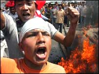 اتوار کی صبح سے نیپالی حکام نے کٹھمنڈو میں پھر سے دن بھر کا کرفیو نافذ کر دیا تھا اور شہر کے مرکزی علاقے کو جانے والے تمام راستوں کو خاردار تار لگا کر بند کر دیا تھا۔ کھٹمنڈو شہر میں موبائل فون کا نظام بھی تاحال معطل ہے۔ سنیچر کو ایک لاکھ سے زائد مظاہرین نے دارالحکومت کے مرکز میں کرفیو کی خلاف ورزی کرتے ہوئے بادشاہت کے خلاف احتجاج کیا تھا۔یہ مظاہرین’ ہم بادشاہت نہیں جمہوریت چاہتے ہیں‘ کے نعرے لگا رہے تھے۔ ادھر سیاسی اپوزیشن نے شاہ گیانندرا کی جانب سے ایک کثیرالجماعتی حکومت میں شامل ہونے کی پیشکش کو مسترد کردیا تھا۔ ایسوسی ایٹڈ پریس کے مطابق دو ہفتوں سے جاری مظاہروں میں اب تک چودہ افراد ہلاک ہو چکے ہیں اور مبصرین کا کہنا ہے کہ مظاہرین کی جمہوریت حامی تحریک نے گزشتہ چند دنوں میں بادشاہت مخالف شکل اختیار کرلی ہے۔ |