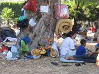 اگر ایک گھنے درخت کے نیچے ہبوش گاؤں سے آئی ہوئی کوئی فیملی اپنے بستربچھائے بیٹھی ہے تو ذرا فاصلے پر پارک کی ریلنگ کے ساتھ قاسمیہ سے آئے ہوئے کسی خاندان نے دو چادریں باندھ کر ذرا سا پردہ دار ماحول بنانے کی کوشش کی ہے اور اس سے بائیں ہاتھ پر معروب گاؤں سے دھکیلی جانے والی کوئی آنٹی سر کے نیچے اینٹ رکھ کر سو رہی ہیں۔ صمیدون نامی ایک این جی او کے لڑکے لڑکیاں ان پناہ گزینوں کی ہر ممکن دیکھ بھال میں لگے ہوئے ہیں۔ ایک نوجوان کارکن احمد فرخ انگریزی جاننے کے سبب وہ چابی بن گیا جس سے اس پارک کا لسانی تالہ کھل گیا۔