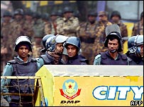 بنگلہ دیش میں اپوزیشن کی جانب سے سڑکوں، ریلوے اور بندرگاہوں کی تین روزہ ناکہ بندی کے اعلان کے بعد ہونے والے مظاہروں میں پولیس نے پتھراؤ کرنے والے مظاہرین پر ربر کی گولیاں چلائی ہیں۔ مقامی ذارئع ابلاغ کے مطابق ان جھڑپوں میں متعدد افراد زخمی ہوئے ہیں۔ ڈھاکہ پولیس کا ایک سب انسپکٹر کنکن نے خبر رساں ادارے اے ایف پی کو بتایا کہ’مظاہرین نے پولیس پر شدید پتھراؤ کیا جس کے بعد ہمارے افسروں نے ہجوم کو منتشر کرنے کے لیے آنسو گیس اور ربر کی گولیاں استعمال کیں‘۔ ڈھاکہ شہر میں فوج کو بھی تعینات کیا گیا ہے جبکہ ہڑتال کی وجہ سے شہر میں کاروبارِ زندگی معطل ہے، سکول بند ہیں اور سڑکوں پر ٹریفک نہ ہونے کے برابر ہے۔ تین روزہ ناکہ بندی کا اعلان ان سیاسی جماعتوں کے اتحاد کی جانب سے کیا گیا ہے جو کہ اس ماہ ہونے والے انتخابات کا انعقاد رکوانا چاہتے ہیں۔ عوامی لیگ اور اس کی اتحادی جماعتوں کا کہنا ہے کہ وہ بائیس جنوری کو ہونے والے الیکشن کا بائیکاٹ کریں گی کیونکہ وہ شفاف اور منصفانہ نہیں ہوں گے۔