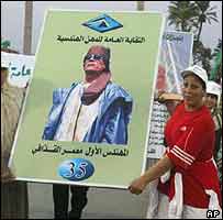 کرنل قدافی نےگفتگو کے دوران برطانوی وزیراعظم کی طرف ”میرے دوست ٹونی بلئیر” کہہ کراشارہ کیا جبکہ عراق کی صورتحال پرانہوں نے سخت تنقید کی۔ ” وہاں کی صورتحال کو سب جانتے ہیں اس بارے میں میرے وضاحت کی کوئی ضرورت نہیں ہے،۔ ”پوری دنیا کا موقف امریکہ کے لوگوں کے ساتھ ایک ہے ہماری ہمدردیاں صرف عراقی عوام کے ساتھ نہیں بلکہ ان امریکی عوام کے ساتھ بھی ہیں جو ایک ایسی جنگ کی قیمت ادا کرچکے ہیں جنکی بنیاد جھوٹ پر کھڑی ہے،۔ ”ہزاروں امریکی غلط معلومات فراہم کرنے کی وجہ سے مارے جا چکے ہیں۔ان لاکھوں عراقی شہریوں کو کون واپس لا ئے گا؟جوکچھ عراق میں ہوا اس نے دنیا کے تمام لوگوں کو غیر محفوظ ہونے کا احساس دلایا،۔ تاہم جب میں نے ان سے یہ سوال کیا کہ کیا اب بھی یہ ممکن ہے کہ لیبیا مغربی دنیا کے ساتھ باہمی مفادات کی بنیاد پر ترقیاتی منصوبوں میں حصہ لے تو کرنل قدافی نے زور دیتے ہوئے کہا کہ”ہاں یہ ممکن ہے اور ہم اس کے لئے کوششیں کر رہے ہیں”۔ وہ گزشتہ چالیس سال سے اقتدار میں ہیں۔اس جمعے کو وہ اپنے متعارف کردہ سیاسی نظام ”جماہریہ” کے تیس سال منا رہے ہیں۔ وہ اسے ”براہ راست جمہوریت” کا نام دیتے ہیں جس میں اختیارات لوگوں کے پاس ہیں مگر مخالفین اسں کوآمریت کے لئے ایک خول قرار دیتے ہیں۔ کرنل قذافی کا کہنا ہے کہ میں اس دن کے انتظار میں ہوں جب لیبیا کےلوگوں کو میری قیادت کی مزید ضرورت نہیں رہے گی۔ مگر انہوں نے طاقت کو چھوڑنے کا کوئی اشارہ نہیں دیا۔ |