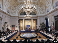 امریکہ میں مشرقِ وسطیٰ میں امن کے لیے ہونے والی کانفرنس اس اعلان کے ساتھ ختم ہوگئی ہے کہ فلسطینی اور اسرائیلی رہنما آج سے وائٹ ہاؤس میں نئے امن مذاکرات کا آغاز کریں گے۔ اسرائیل اور فلسطین دونوں اگلے برس کے خاتمے تک مشرقِ وسطیٰ میں امن کی خاطر ایک جامع معاہدے کے لیے مذاکرات پر رضا مند ہوگئے ہیں۔ اس پیشرف کے بارے میں اخبار نویسوں کو امریکی سیکریٹری خارجہ کونڈولیزا رائس نے واشنگٹن کے قریب اناپولیس میں منعقدہ کانفرنس کے بعد آگاہ کیا۔ کانفرنس میں فلسطین کے صدر محمود عباس اور اسرائیلی وزیرِ اعظم ایہود اولمرت شریک تھے۔ اس سے قبل امریکی صدر جارج بش نے کہا تھا کہ دونوں فریق اگلے برس کے آخر تک امن کا ایک جامع معاہدہ کرنے کے پابند ہیں۔ مشرقِ وسطیٰ امن کانفرنس کا افتتاح کرتے ہوئے صدر جارج بش نے کہا مذاکرات کے دوران وہ تمام حل طلب مسائل جو فریقین کے درمیان موجود ہیں زیرِ بحث لائے جائیں گے۔