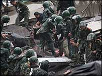 خبر رساں ادارے ژن ہوا کا یہ بھی کہنا ہے کہ زلزلے کے مرکز کے نزدیک واقع ایک اور شہر میانیانگ میں اندازاً اٹھارہ ہزار افراد ملبے تلے دفن ہیں جبکہ ایک اور قصبےمیانز ہو میں کم از کم چار ہزار آٹھ سو افراد پھنسے ہوئے ہیں اور زلزلے کے نتیجے میں گرنے والے مٹی کے تودوں نے قصبے تک پہنچنے کے تمام راستے مسدود کر دیے ہیں۔ بی بی سی کے کوئنٹن سمروِل کا کہنا ہے کہ چینی فوج تیز رفتاری سے حرکت میں آنے کے حوالے سے کافی اچھا ریکارڈ رکھتی ہے اور اس لیے وہ جلد امدادی کاموں میں حصہ لے سکتے ہیں۔ انہوں نے کہا کہ متاثرہ علاقوں سے خبریں بہت تیزی سے آ رہی ہیں اور یہ پہلی بار ہے کہ چینی سرکاری میڈیا اتنی تندہی سے کام کر رہا ہے۔ | اسی بارے میں چین: وسیع امدادی آپریشن شروع13 May, 2008 | آس پاس چین میں زلزلہ: 10,000 ہلاکتیں12 May, 2008 | آس پاس جنوب مغربی چین میں زلزلہ12 May, 2008 | آس پاس مغربی انڈونیشیا میں شدید زلزلہ20 February, 2008 | آس پاس یونان: زلزلے کے شدید جھٹکے06 January, 2008 | آس پاس سماٹرا زلزلہ: نو افراد ہلاک 13 September, 2007 | آس پاس پیرو:پانچ سوہلاک، تین روزہ سوگ17 August, 2007 | آس پاس | ||||||||||||||||||||||||||||||||||||||||