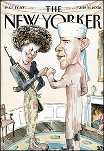 موقر امریکی جریدے نیو یارکر نے ڈیموکریٹک پارٹی کے صدارتی امیدوار باراک اوبامہ کا ایک کارٹون شائع کیا ہے جس میں انہیں روایتی اسلامی کپڑوں میں، اور ان کی اہلیہ کو ایک دہشت گرد کے طور پر پیش کیا گیا ہے۔ دیوار پر القاعدہ کے سربراہ اسامہ بن لادن کی ایک تصویر بھی ٹنگی ہوئی ہے اور اس کے نیچے امریکی قومی پرچم جلتا ہوا دیکھا جاسکتا ہے۔ امریکہ میں انتہائی دائیں بازو کے نظریات رکھنے والے لوگوں نے اوبامہ کو ’اوسامہ‘ کہہ کر، اور انہیں مسلمان قرار دیکر، یہ تاثر پیدا کرنے کی کوشش کی ہے کہ صدارتی انتخاب میں باراک اوبامہ کی کامیابی براہ راست دہشت گردوں کی کامیابی ہوگی۔ اوبامہ کے والد مسلمان تھے اور وہ اب بھی اپنا پورا نام باراک حسین اوبامہ لکھتے ہیں۔ لیکن وہ متعدد بار یہ واضح کرچکے ہیں کہ وہ مسلمان نہیں عیسائی ہیں۔  | | | اوبامہ امریکہ کے پہلے سیاہ فام صدر بن سکتے ہیں |