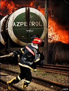 انہوں نے کہا کہ روسی فوجوں نے اس بارود کے ذخیرے اور ٹرین کی پٹڑی پر بارودی سرنگیں لگائیں ہوں گی۔ جورجیا کہ حکام نے جوگوری سے ہجرت کرنے والے ہزاروں لوگوں کو اپنے گھروں کو لوٹنے میں مدد کر رہے ہیں اتوار کو علاقے میں بارودی سرنگیں صاف کرنے کا ایک آپریشن کیا۔ جورجیا کے وزیر اعظم لاڈو گرجنادزی نے کہا کہ آگ بجھ جانے کے بعد نقصان کا اندازہ کیا جائے گا۔ انہوں نے کہ ریلوے جورجیا کی معیشت بلکہ خطے کے دوسرے ملکوں کی معیشت کے لیے بھی ضروری ہے۔ جورجیا کے دارالحکومت تبلیسی سے ریل کی پٹڑی گزرتی ہے جو آگے چل کر تین مختلف سمتوں میں چلی جاتی ہے۔ ایک طرف دو پٹڑیاں بحیرہ اسود کی بندگاہوں پوٹی اور بتومی کی طرف چلی جاتی ہیں جبکہ جنوبی مغرب کی طرف جانے والی شاخ جورجیا کو ترکی سے ملاتی ہے۔ بارودی سرنگ سے ٹکرا کر تباہ ہونے والی ایک ٹرین پر آذربائجان کی ایک کمپنی از پٹرول کا نام لکھا ہوا تھا۔ | اسی بارے میں روس پر ’دراندازی‘ اور بمباری کا الزام10 August, 2008 | آس پاس گوری میں موڈ کی تبدیلی10 August, 2008 | آس پاس جورجیا کو کنٹرول کی منتقلی شروع14 August, 2008 | آس پاس روسی حملے کے دور رس نتائج: امریکہ14 August, 2008 | آس پاس ’روس فائر بندی نافذ کرے گا‘16 August, 2008 | آس پاس ’فائربندی لیکن فوجی انخلاء نہیں‘17 August, 2008 | آس پاس جورجیا سے روسی انخلاء کا اعلان17 August, 2008 | آس پاس | ||||||||||||||||||||||||||||||||||||||||