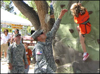 جب تک یہ تقریب چلتی رہی، گانا بجانا بند تھا، لیکن اس کے بعد موج مستی شروع ہوگئی۔ مجھے لگا کہ شاید یہ اچھا طریقہ ہے کہ ملک کے فوجیوں کو عوام کے سامنے عزت دینے کا۔ لیکن ابھی بہت کچھ دیکھنا باقی تھا۔ جیسے ہی میں آگے بڑھا تو کھلونوں، کپڑوں، کھیل تماشوں، ٹاکو اور میکسیکن کھانے کے اسٹالوں کے سامنے امریکی فوج کی مختلف یونٹوں کے اسٹال لگے ہوئے تھے، یو ایس مرینز، یو ایس نیوی، نیشنل گارڈز، ایئر فورس، وغیرہ۔ ان اسٹالوں پر چابی کے رِنگ اور آرم بینڈ جیسی چیزیں مفت دیکر بچوں اور نوجوانوں کو متوجہ کرنے کی کوشش کی جارہی تھی۔ ایک اسٹال پر تو ہر طرح کے جان لیوا ہتھیار سجائے ہوئے تھے، راکٹ لانچر، گرینیڈ لانچر، طرح طرح کی بندوقیں اور چھوٹے چھوٹے بچے انہیں چھوکر دیکھ رہے تھے اور فوجی افسر انہیں بتا رہے تھے کہ کون ہتھیار کتنا مار سکتا ہے۔ نئے خون کو کم عمر میں فوجی کی جانب متوجہ کرنے کے لیے اس سے بہتر کیا طریقہ ہوسکتا تھا۔ لیکن گڈے گڈیوں، ہاتھی گھوڑوں، ہی مین، سپرمین کے درمیان ان ہتھیاروں کو دیکھ کر تھوڑی حیرانی ضرور ہوئی۔ شان لانگسٹیڈ اپنے سات سالہ بیٹے کے ساتھ کھڑی تھیں۔ میں نے پوچھا کہ کیا انہیں یہ صحیح لگتا ہے۔