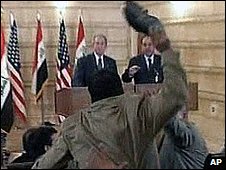 وائٹ ہاؤس کی ترجمان نے کہا ہے کہ صدر جارج بش ان پر جوتا پھینکنے والے عراقی صحافی منتظر الزیدی سے ناراض نہیں ہیں۔ صدر بش کی ترجمان ڈانا پرینو نے کہا ہے کہ امریکی صدر کو عراق کے عدالتی نظام پر مکمل یقین ہے۔ صدر بش تو جوتے سے بچ گئے تھے لیکن ان کی ترجمان ڈانا پرینو جوتا کے پھینکے جانے کے بعد پیدا ہونےوالی بھگدڑ کے دوران آنکھ کے پاس خراشیں آئی تھی۔ منگل کو منتظر الزیدی کو ہائی جوڈیشل کونسل کے سامنے پیش کیاگیا۔ منتظر الزیدی کے بھائی نےالزام لگایا ہے کہ منتظر کو قید کے دوران ’تشدد‘ کا نشانہ بنایا گیا ہے۔ عراق کی فوج نےان الزامات کی تردید کی ہے کہ منتظر الزیدی کو حراست میں تشدد کا نشانہ بنایا جا رہا ہے۔ منتظر کے بڑے بھائی ضرغام زیدی نے بی بی سی کو بتایا کہ منتظر کو اتنا مارا گیا ہے کہ ان کا ایک ہاتھ اور کئی پسلیاں ٹوٹ گئی ہیں۔ منتظر کی ایک آنکھ پر بھی زخم ہے اور ان کو اندرونی زخم بھی آئے ہیں۔ عراقی حکام نے کہا ہے کہ منتظر پر عراق کے قوانین کے تحت مقدمہ چلایا جائے گا لیکن ابھی تک یہ واضح نہیں کہ ان کے خلاف کیا الزامات عائد کیئے جائیں گے۔ عراقی قانونی ماہرین کے مطابق منتظرالزیدی پر ایک غیر ملکی رہنما اور ان کے ساتھ کھڑے عراقی وزیر اعظم نوری المالکی کی تضحیک کرنے کے جرم میں مقدمہ چلایا جا سکتا ہے اور ان کو زیادہ سے زیادہ دو سال قید کی سزا سنائی جا سکتی ہے۔ بی بی سی کے نامہ نگار کے مطابق قاہرہ میں قائم البغدادیہ ٹی وی کے لیے کام کرنے والے غیر معروف صحافی منتظرالزیدی اب نہ صرف عراق میں بلکہ عرب دنیا میں بہت سے لوگوں کے ہیرو بن گئے ہیں۔ بہت سے لوگوں کا خیال ہے کہ امریکہ کے انتہائی غیر مقبول صدر کو اس سے بہتر الوداع نہیں کہا جا سکتا تھا۔