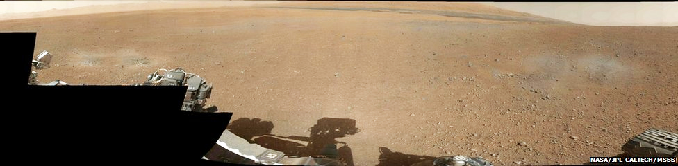 اس چوڑی تصویر کے وسط میں ایک بڑا پہاڑ نظر آ رہا ہے جو گیل گڑھے کے درمیان واقع ہے۔ یہ وہ گڑھا ہے جس کے اندر کیوروسٹی اتری تھی۔