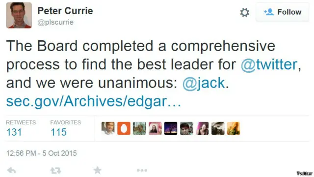 ٹوئٹر کے بورڈ میں موجود سرمایہ کار پیٹر کیوری نے ٹویٹ میں لکھا کہ ’بورڈ نے ایک جامع عمل کے ذریعے ٹوئٹر کے لیے بہترین سربراہ مقرر کیا اور ہم جیک کے تقرر پر مکمل طور پر متفق ہیں۔‘