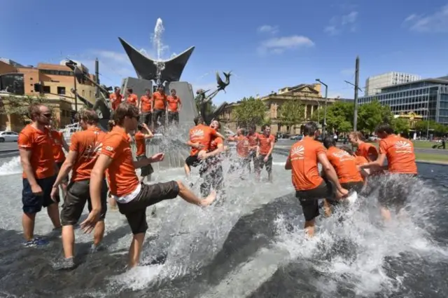فاتح ٹیم نے اپنی جیت کا جشن ایڈیلیڈ کے شہری مرکز کے فوارے میں چھلانگیں لگا کر منایا۔