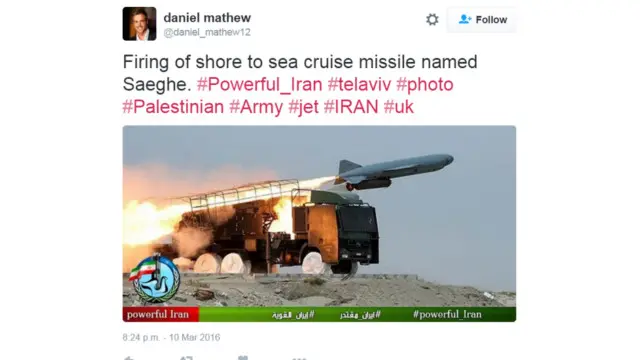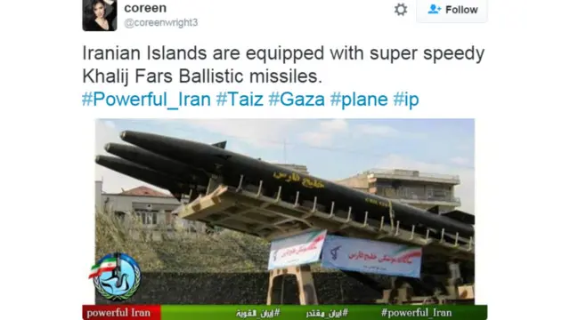 ٹویٹ کی گئی ان تمام تصاویر میں ایک چیز مشترک ہے اور وہ ہے ایک لوگو جس میں ایک فاختہ ہے اور اس کی کمر پر موجود بندوق کی نال پر ایرانی جھنڈا لہرا رہا ہے۔ ہر ٹویٹ میں powerful_iran# کا ہیش ٹیگ ہوتا ہے جو انگریزی، عربی اور فارسی تینوں زبانوں میں ہوتاہے۔