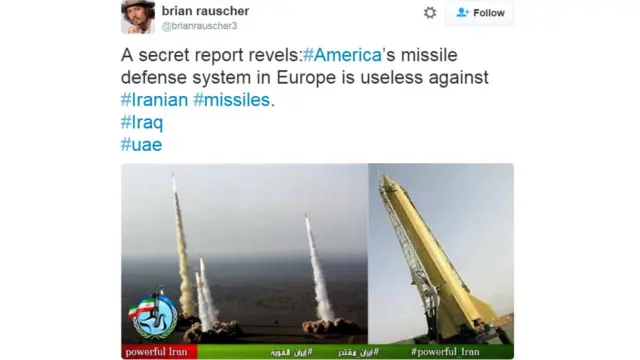 ان اکاؤنٹس کی پروفائل کی تصاویر ہالی وڈ اداکاروں کی یا انٹرنیٹ سے اٹھائی گئی ہیں، لیکن ان کی جانب سے کی گئی تقریباً ہر ٹویٹ میں ایران فوجی آلات کی تصاویر ہوتی ہیں جن کے ساتھ بےترتیب اور غیر متعلقہ ہیش ٹیگز ہوتے ہیں۔