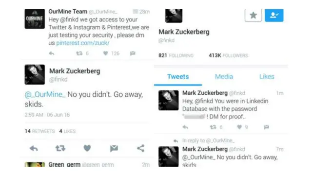 ٹوئٹر پر پیغام میں گروپ نے فیس بک کے بانی کو مخاطب کر کے کہا کہ ’ہم نے آپ کے ٹوئٹر، انسٹاگرام اور پنٹریسٹ اکاؤنٹس تک رسائی حاصل کر لی ہے۔ ہم صرف آپ کی سکیورٹی کا جائزہ لے رہے تھے۔ ہمیں ڈی ایم( ڈائریکٹ میسج) بھیجیں۔‘