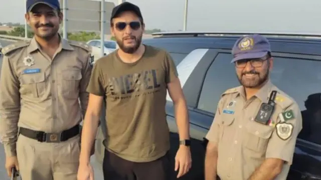 تو جناب ہوا کچھ یوں کے دو روز قبل شاہد آفریدی این-فور موٹر وے پر دورانِ سفر اوور سپیڈنگ کے باعث اپنا چالان کروا بیٹھے اور تصویر میں نظر آنے والے اہلکار وہی ہیں جنھوں نے 167 کلومیٹر فی گھنٹہ کی رفتار سے گاڑی ’بھگانے‘ پر شاہد آفریدی کا چالان کیا تھا۔
