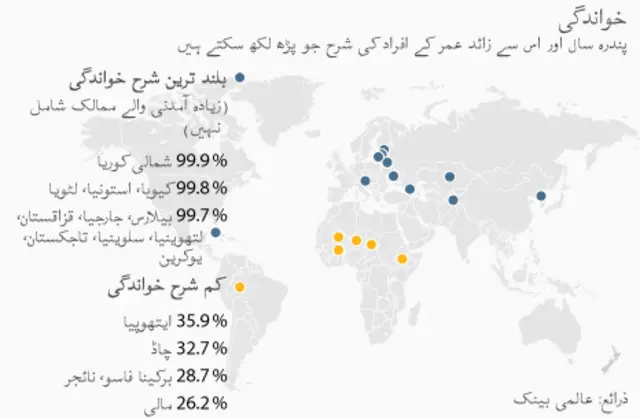 دنیا کے ان بیس میں سے بہت سے ممالک جہاں خواندگی کی شرح کم ترین ہے، افریقہ میں ہیں۔ البتہ بنگلہ دیش اور پاکستان مثتثنیات میں ہیں جہاں شرحِِ خواندگی بالترتیب تریپن اعشاریہ پانچ فیصد اور چون اعشاریہ دو فیصد ہے۔