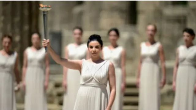 جمعرات کو مشعل روشن کرنے کی تقریب میں قدیم یونانی لباس میں ملبوس اداکارہ اینو مینیگاکی نے عدسے کی مدد سے سورج کی شعاؤں سے مشعل جلائی۔