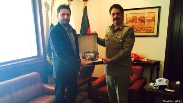 پاکستانی بّری فوج کے سربراہ جنرل راحیل شریف نے منگل کو پاکستانی کرکٹ ٹیم کے آل راؤنڈر شاہد آفریدی کو انٹرنیشنل کرکٹ کریئر میں 17 سال خدمات کے اعزاز میں یادگاری شیلڈ پیش کی۔