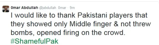 انھوں نے ٹویٹ کی ہے کہ وہ پاکستانی کھلاڑیوں کے شکرگزار ہیں جنھوں نے صرف نازیبا اشارے کیے، تماشائیوں پر بم نہیں پھینکے اور فائرنگ شروع نہیں کر دی۔