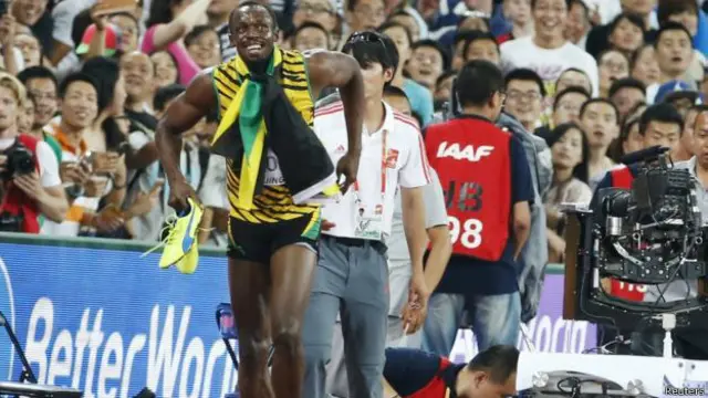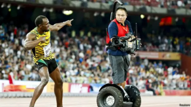 یوسین بولٹ عالمی ایتھلیٹکس مقابلوں میں 200 میٹر کی دوڑ جیتنے کی خوشی منانے میں مگن تھے کہ اسی دوران ایک کیمرا مین اپنے موٹرائزڈ سکوٹر پر کنٹرول کھو بیٹھے اور سکوٹر بولٹ کی ٹانگوں پر چڑھ دوڑا۔