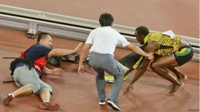 جمیکا سے تعلق رکھنے والے مشہور ایتھلیٹ یوسین بولٹ جمعرات کو بیجنگ میں ہونے والے عالمی ایتھلیٹکس کے مقابلوں میں 200 میٹر کی دوڑ جیتنے کے فوراً بعد ایک کیمرا مین سے ٹکرا کر گر پڑے۔