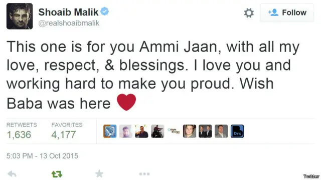 شعیب ملک نے سنچری کرنے کے بعد اپنی ٹویٹ میں لکھا کہ ’یہ آپ کے لیے امی جان، میری جانب سے بہت ساری محبت، دعاؤں اور خلوص کے ساتھ۔ مجھے آپ سے محبت ہے اور میں آپ کا سر فخر سے بلند کرنے کے لیے محنت کر رہا ہوں۔ کاش ابّا یہاں ہوتے۔‘