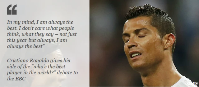 رونالڈو سے جب ان کے حریف سمجھے جانے والے کھلاڑی لائنل میسی کے بارے میں پوچھا گیا تو انھوں نے کہا کہ ’میں آراء کی قدر کرتا ہوں، ہوسکتا ہے کہ آپ کی رائے میں میسی مجھ سے بہتر ہو لیکن میرے خیال میں، میں ان سے بہتر ہوں۔‘