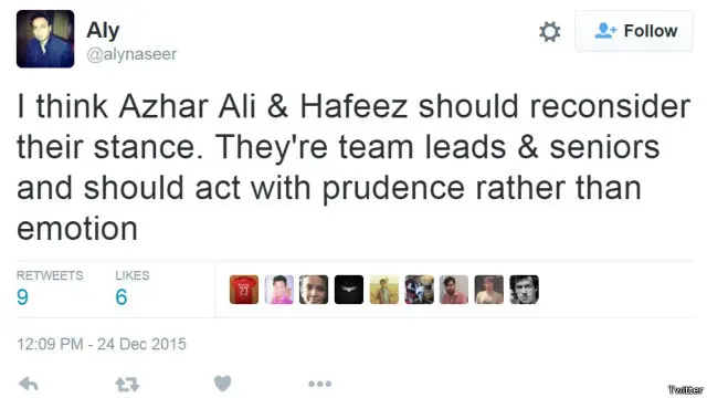 علی نصیر نے ٹوئٹر پر لکھا: ’میں سمجھتا ہوں اظہر علی کو اپنے موقف پر نظرِ ثانی کرنی چاہیے۔ وہ ٹیم کے سرکردہ اور سینیئر کھلاڑی ہیں اور انھیں دانائی کا مظاہرہ کرنا چاہیے نہ کہ جذباتیت کا۔‘