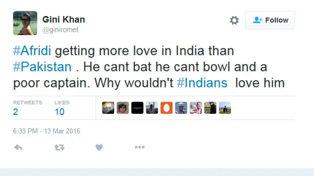 ایک پاکستانی مداح نے اس حوالے سے ٹوئٹ کیا ہے کہ ’آفریدی نہ بیٹنگ کر سکتے ہیں نہ باؤلنگ اور انتہائی ناقص کپتانی کرتے ہیں، اسی وجہ سے بھارتی ان سے بہت پیار کرتے ہیں۔‘