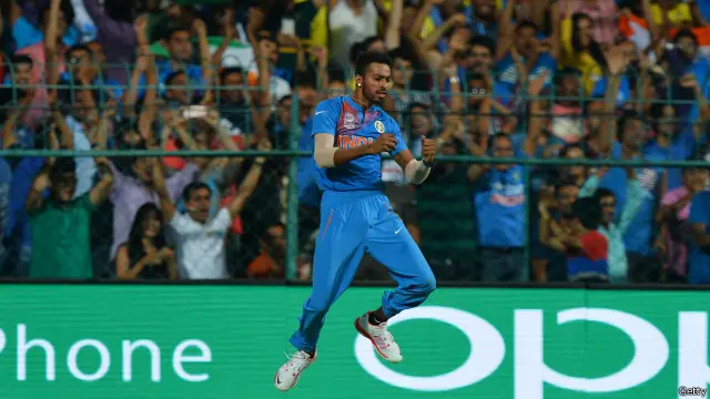 آسٹریلین اننگز کا آخری اوور پانڈیا کروانے آئے تو پہلی ا ہی گیند پر جیمز فالکنر دس رنز بنا کر کیچ دے بیٹھے۔