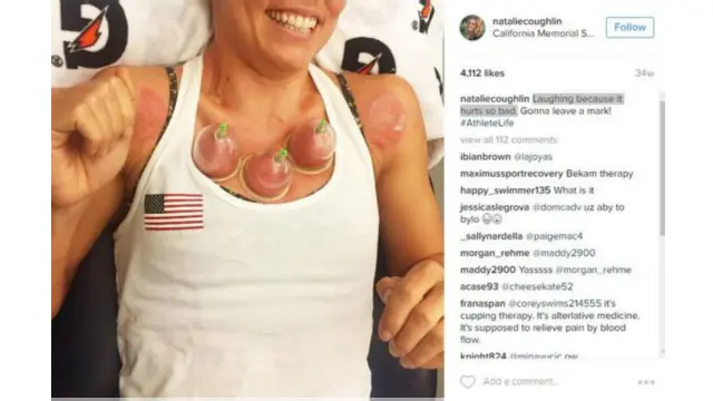 امریکی خاتون تیراک نیٹیلی کفلین نے بھی اپنی تصاویر شائع کی ہیں جن میں ان کے سینے پر کپ لگے ہیں جو ان کی جلد کے ساتھ چپکے ہوئے ہیں۔