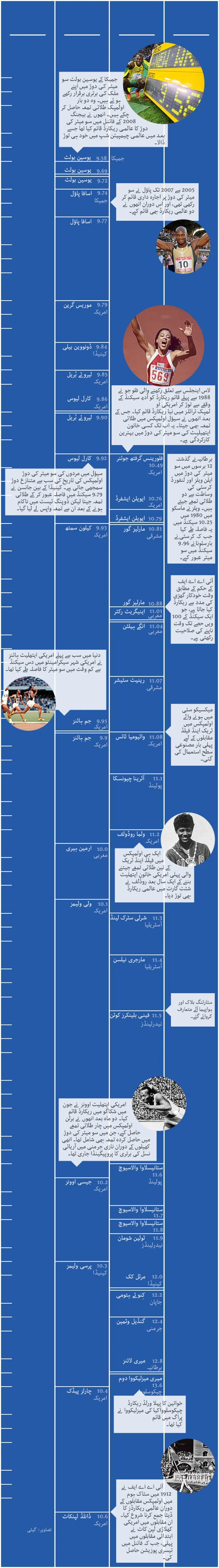 بی بی سی سپورٹس کی جانب سے سو میٹر کے مقابلوں میں ریکارڈز کی تاریخ پیش کی جا رہی ہے۔