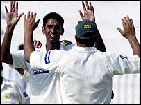 اس سے پہلے پاکستان کی پوری ٹیم ایک سو پچھتر کے اسکور پر ہوگئی۔ اس طرح بنگلہ دیش کو پہلی اننگز میں پاکستان پر ایک سو تراسی رنز کی برتری حاصل ہو گئی ہے۔ محمد رفیق نے چھتیس رنز دیکر پانچ کھلاڑی آؤٹ کئے جبکہ خالد محمود نے سینتیس رنز کے عوض چار وکٹیں حاصل کیں۔ بنگلہ دیش کی ٹیم نے دوسرے دن کھیل کا آغاز کیا تو لنچ سے پہلے ہی دوسو اکیاسی رنز بناکر آؤٹ ہوگئی۔ گزشتہ روز جب کھیل ختم ہوا تو بنگلہ دیش کی ٹیم دو سو اڑتالیس رنز پر کھیل رہی تھی اور اس کے چھ کھلاڑی آؤٹ ہوئے تھے۔ اس طرح جمعرات کی صبح جب کھیل شروع ہوا تو بنگلہ دیش کے باقی چار کھلاڑی مجموعی اسکور میں صرف تینتیس رنز کا ہی اضافہ کر سکے۔ بنگلہ دیش کے لئے حبیب البشر نے سب سے زیادہ بہتّر رنز بنائے جبکہ دوسرے نمبر پر جاوید عمر رہے جہنوں نے اڑتیس رنز بنائے۔ آخری تین کھلاڑیوں کو شبیر احمد نے آؤٹ کیا۔ انہوں نے چوہتر رنز دیئے۔ عمر گل پاکستان کی طرف سے سب سے زیادہ کامیاب بالر رہے۔ انہوں نے چھیاسی رنز کے عوض چار کھلاڑیوں کو آؤٹ کیا۔ ثقلین مشتاق اور یاسر علی نے ایک ایک وکٹ حاصل کی جبکہ بنگلہ دیش کا ایک کھلاڑی رن آؤٹ ہوگیا۔ پاکستان کی طرف سے محمد حفیظ نے اکیس، سلمان بٹ نے بارہ، یونس خان چونتیس، فرحان عادل پچیس، راشد لطیف پانچ، ثقلین مشتاق نو، اور عمر گل نے پانچ رنز بنائے۔ یاسر حمید پاکستان کے سب کامیاب بیٹسمین رہے۔ انہوں نے انتالیس رنز بنائے۔ پاکستان کے سب سے سینیئر کھلاڑیوں میں سے ایک انضمام الحق اس مرتبہ بھی ناکام رہے۔ وہ صرف دس رنز بنا پائے۔ |