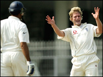 ایجبسٹن میں کھیلے جانے والے دوسرے ٹیسٹ کے پہلے روز کھیل کے اختتام پر انگلینڈ نے دو وکٹوں پر 102 رنز بنائے ہیں۔ اس سے پہلے سری لنکا کا کوئی بھی کھلاڑی انگلینڈ کے پیس اٹیک کا جم کر مقابلہ نہ کر سکا اور پوری ٹیم 141 رنز بنا کر آؤٹ ہو گئی۔ سری لنکا کے ٹاپ سکورر چمندہ واس رہے جو 30 رنز بنا کر ناٹ آؤٹ رہے۔ سری لنکا کی طرف سے دسویں نمبر پر بیٹنگ کرنے والے مالنگا نے 26 رنز کی کارآمد اننگز کھیلی۔ انگلینڈ کی طرف سے لیام پلنکیٹ نے تین وکٹیں لیں جبکہ میتھیو ہوگارڈ، اینڈریو فلنٹاف اور ساجد محمود نے دو دو کھلاڑیوں کو آؤٹ کیا۔ انگلینڈ کی ٹیم میں شامل واحد سپنر مونٹی پپنیسر نے ایک وکٹ لی۔ جب انگلینڈ نے اپنی اننگز شروع کی تو پہلی وکٹ کی شراکت میں چھپن رنز بنے۔ انگلینڈ کی طرف سے آؤٹ ہونے والے پہلے کھلاڑی مارکس ٹریسکوتھک تھے جو 27 رنز بنا کر مرلی دھرن کی گیند پر وکٹوں کے پیچھے کیچ ہوئے۔ دوسرے اوپنر اینڈریو سٹراس تیس رنز بنا کر رن آؤٹ ہوئے۔ سری لنکا کے خلاف دوسرے ٹیسٹ میں انگلینڈ نے ٹاس جیت کر پہلے بالنگ کرنے کا فیصلہ کیا ہے۔ انگلینڈ نے اپنی ٹیم میں کوئی تبدیلی نہیں کی اور وہی ٹیم میدان میں اتاری ہے جس نے سری لنکا کو لارڈز میں فالوآن پر مجبور کیا تھا۔ دوسری طرف سری لنکا نے اپنی ٹیم میں دو تبدیلیاں کی ہیں اور مائیکل وانڈورٹ اور لاسیتھ مالنگا کو کھیلنے کا موقع دیا ہے۔ انگلینڈ: مارکس ٹریسکوتھک، اینڈریو سٹراس، الیسٹر کُک، کیون پیٹرسن، پال کولنگ وڈ، اینڈریو فلنٹاف (کپتان)، گیرانٹ جونز، لیام پلنکٹ، میتھیو ہوگارڈ، ساجد محمود اور مونٹی ہوگارڈ۔ سری لنکا: اُپل تھرانگا، مائیکل وانڈورٹ، کمار سنگاکارا، ماہیلا جے وردنا (کپتان)، تھلان سماراویرا، تلکارتنے دلشان، فرویز مہاروف، چمندہ واس، نیوان کلوسیکرا، متیا مرلی دھرن اور لاسیتھ مالنگا۔ | اسی بارے میں مہیلا جے وردھنے کی سینچری14 May, 2006 | کھیل سری لنکا نے میچ بچالیا15 May, 2006 | کھیل انگلینڈ کی عمدہ بیٹنگ 11 May, 2006 | کھیل امپائر کے خلاف اپیل کے حق پر غور06 May, 2006 | کھیل | ||||||||||||||||||||||||||||||||||||||||