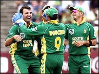 ان کے آؤٹ ہونے کے کچھ ہی دیر بعد ژاک کیلس نے عبدالرزاق کو آؤٹ کر دیا جبکہ اظہر محمود کو کیمپ نے وکٹ کیپر کے ہاتھوں کیچ کروا دیا۔ اس کے بعد نتینی کی گیند پر رانا نوید کا کیچ باؤچر نے لیا وہ تین رنز ہی بنا سکے۔ عبدالرحمن بھی کوئی رن نہ بنا سکے اور لینگیویلٹ کی گیند پر ان کا کیچ وکٹ کیپر نے مارک باؤچر نے لیا۔ پاکستان کے آخری آؤٹ ہونے والے کھلاڑی محمد آصف تھے جو بغیر کوئی رن بنائے اینڈریو ہال کی گیند پر بولڈ ہوگئے۔ جنوبی افریقہ کے کپتان گریم سمتھ نے ٹاس جیت کر پاکستان کو پہلے کھیلنے کی دعوت دی تھی۔ پاکستانی ٹیم: جنوبی افریقہ کی ٹیم: | اسی بارے میں پورٹ الزبتھ میں بارش، میچ کالعدم09 February, 2007 | کھیل آفریدی پر چار ون ڈے کی پابندی10 February, 2007 | کھیل راؤ افتخار بھی جنوبی افریقہ جائیں گے06 February, 2007 | کھیل سنچورین: جنوبی افریقہ کی جیت04 February, 2007 | نیٹ سائنس | ||||||||||||||||||||||||||||||||||||||||