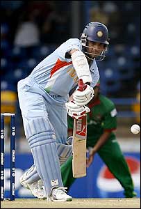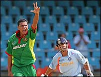ایم ایس دھونی محمد رفیق کی گیند پر آفتاب احمد کے ہاتھوں کیچ آؤٹ ہو گئے۔ دھونی کوئی رن نہ بنا سکے۔ سارو گنگولی کو محمد رفیق نے ہی عبدالرزاق کے ہاتھوں کیچ کروایا۔ انہوں نے 66 رنز بنائے۔ انڈیا کے چوتھے آؤٹ ہونے والے کھلاڑی راہول ڈراوڈ چودہ رنز بنا کر محمد رفیق کی گیند پر ایل بی ڈبلیو ہو گئے۔ اس سے قبل سچن تندولکر عبدالرزاق کی گیند پر سات رنز بنا کر آؤٹ ہو گئے۔ ان کا کیچ مشفیق الرحمن نے لیا۔ میچ کے آغاز پر ہی انڈیا کو اس وقت نقصان کا سامنا کر نا پڑا جب تیسرے ہی اوور میں آؤٹ آف فارم بیٹسمین وریندر سہواگ کو مشرفِ مرتضیٰ نے بولڈ کر دیا۔ انہوں نے صرف دو رنز بنائے۔ ان کے بعد دوسرے آؤٹ ہونے والے کھلاڑی اتھاپا کا کیچ مشرف کی گیند پر آفتاب احمد نے لیا۔ اتھاپا محض نو رنز ہی بنا سکے۔ انڈیا نے ٹاس جیت کر پہلے بیٹنگ کرنے کا فیصلہ کیا تھا۔ بنگلہ دیش نے گزشتہ ورلڈ کپ کے دوران کمزور پرفارمنس کے بعد اپنے کھیل میں خاصی بہتری لانے کی کوشش کی ہے۔ انڈیا کے کپتان راہول ڈراوڈ کا کہنا ہے ’ہم بنگلہ دیش کے خلاف کافی عرصے سے نہیں کھیلے ہیں تاہم اپنے گزشتہ دورے کے دوران ہمیں بنگلہ دیش کے ہاتھوں ون ڈے میچ میں شکست کا سامنا رہا تھا‘۔