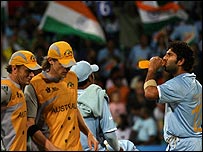 ڈربن میں ہونے والے ورلڈ ٹوئنٹی ٹوئنٹی کے دوسرے سیمی فائنل میں دلچسپ مقابلے کے بعد انڈیا آسٹریلیا کو پندرہ رنز سے شکست دے کر فائنل میں پہنچ گیا ہے جہاں اس کا مقابلہ روایتی حریف پاکستان سے ہوگا۔ انڈیا نے سست آغاز کے بعد یوراج سنگھ کی جارحانہ بیٹنگ کی بدولت مقررہ بیس اوورز میں پانچ وکٹوں کے نقصان پر 188 رنز بنائے تھے جس کے جواب میں آسٹریلیا کی ٹیم بیس اوورز میں سات وکٹوں کے نقصان پر 173 رنز بنا پائی۔ یوراج سنگھ نے صرف تیس گیندوں پر پانچ چھکوں اور پانچ چوکوں کی مدد سے ستر رنز بنائے۔ یوراج کو مین آف دی میچ کے ایوارڈ سے نوازا گیا۔ آسٹریلیا کی جانب سے سب سے زیادہ سکور میتھیو ہیڈن نے بنایا۔ وہ 62 رنز بنا کر سریسانتھ کی گیند پر بولڈ ہوئے۔ سمنڈز نے 43 رنز بنائے اور انہیں عرفان پٹھان نے بولڈ کیا۔ آسٹریلیا کی پہلی وکٹ 36 کے مجموعی سکور پر گری جب کپتان گلکرسٹ کو سریسانتھ نے بولڈ کر دیا۔ ہوج صرف گیارہ رنز بنا کر پٹھان کی گیند پر کیچ آؤٹ ہوئے۔ سریسانتھ نے عمدہ بالنگ کی اور چار اوورز میں صرف بارہ رنز دے کر دو کھلاڑیوں کو آؤٹ کیا۔