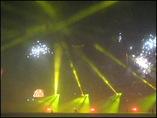 رنگا رنگ تقریب کے سامنے میچ کون دیکھتا، پچپن ہزار سیٹوں والے سٹیڈیم میں سب کی نظریں امریکہ اور ہالینڈ سے لائی گئیں حسیناؤں پر تھیں جنہوں نے تقریب کی فضا ہوش ربا بنادیا۔ اس موقع پر پرکشش لیزر اور لائٹ شو کے دوران ایک وائلن نواز موسیقی کا جادو بکھیرتا رہا۔ اور جب ایسا لگا کہ اب گیم ختم ہوگیا، بالکل اسی وقت کِنگ خان سٹیڈیم کے اپر سٹینڈ میں نمودار ہوائے اور جیسے ایک طوفان آگیا ہو۔ پِچ پر برینڈن میکلم اپنی طوفانی بلے بازی کا جوہر دکھا رہے تھے اور سٹیڈیم میں موجود شائقین کا سمندر شاہ رخ خان کی ایک جھلک دیکھنے کو امنڈ رہا تھا۔ لگتا تھا کہ جیسے کرکٹ کی میچ میں کسی کی دلچسپی نہیں۔ جب میکلم کے چھکے پر ایک گینڈ میدان سے باہر جارہی تھی اسی وقت بالی وُڈ کی موسیقی کی شور کے درمیان ایک لڑکی اپنی ماں کو موبائل فون پر یہ کہ رہا تھا: ’ماما، میں کِنگ خان سے صرف پچاس فِٹ دوری پر ہوں۔‘