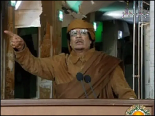 انہوں نے خطاب کے دوران لیبیا میں قانون کا درجہ رکھنے والی خود ان کی تصنیف کردہ گرین بک اپنے ہاتھ میں اٹھا رکھی تھی۔ انہوں نے کہا کہ جو لوگ لیبیا کو نقصان پہنچانا چاہتے ہیں ان کی سزا موت ہے۔