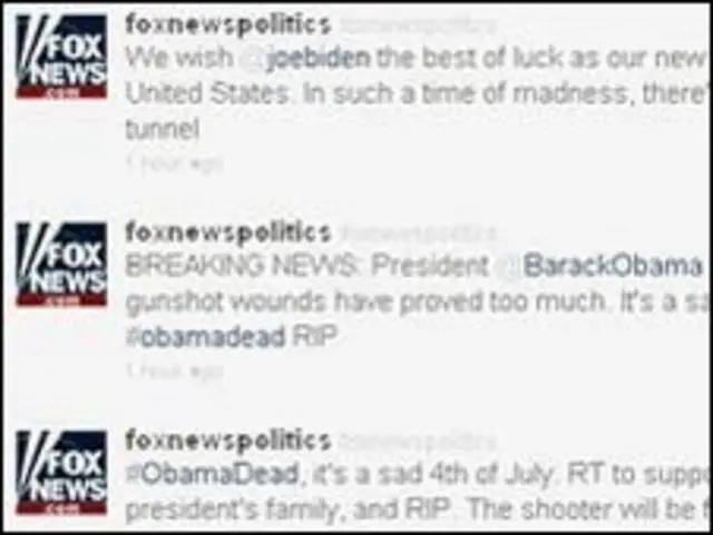 ٹوئٹر پر فاکس نیوز پالیٹکس میں بریکنگ نیوز کے عنوان سے یہ عبارت آویزاں کی گئی: ’براک اوبامہ کو ہلاک کردیا گیا ہے۔ ان کو دو گولیاں لگیں جو جان لیوا ثابت ہوئیں۔‘