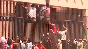 پولیس اہلکاروں نے مظاہرین پر قابو پانے کی کوشش میں فائرنگ کی ہے لیکن وہ انہیں احاطے میں داخل ہونے سے نہیں روک پائے۔ بہت سے لوگ اس واقعے میں زخمی ہوئے تاہم بعد میں سیکورٹی فورسز نے انہیں منتشر کر دیا۔