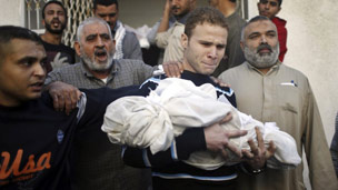 بی بی سی عربی کے جہاد مشراوی اپنے گیارہ ماہ کے بیٹے عمر کی لاش کے ساتھ جو ایک اسرائیلی حملے کے نتیجے میں ہلاک ہوا۔